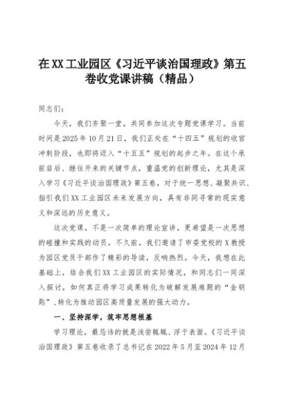 【七哥公文】2025年:在XX工业园区《习近平谈治国理政》第五卷收党课讲稿(精品)+更多免费公文+VX:QiGeGongWen2024