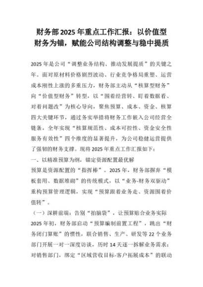 【七哥公文】2025年:财务部2025年重点工作汇报:以价值型财务为锚,赋能公司结构调整与稳中提质+更多免费公文+VX:QiGeGongWen2024