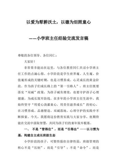 【七哥公文】2025年:小学班主任经验交流发言稿:以爱为犁耕沃土,以德为炬照童心+更多免费公文+VX:QiGeGongWen2024