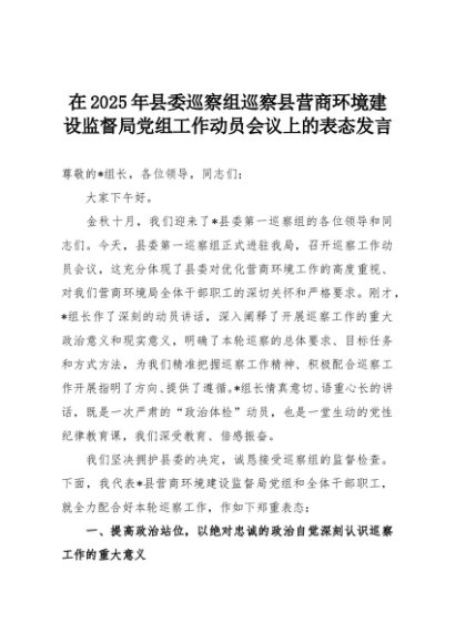 【七哥公文】2025年:在2025年县委巡察组巡察县营商环境建设监督局党组工作动员会议上的表态发言+更多免费公文+VX:QiGeGongWen2024