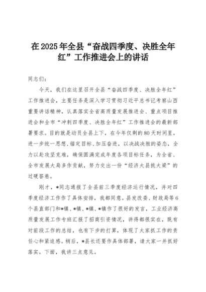 【七哥公文】2025年:在2025年全县“奋战四季度、决胜全年红”工作推进会上的讲话+更多免费公文+VX:QiGeGongWen2024