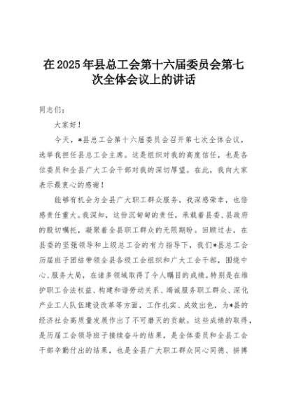 【七哥公文】2025年:在2025年县总工会第十六届委员会第七次全体会议上的讲话+更多免费公文+VX:QiGeGongWen2024