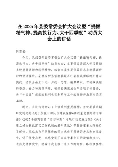【七哥公文】2025年:在2025年县委常委会扩大会议暨“提振精气神、提高执行力、大干四季度”动员大会上的讲话+更多免费公文+VX:QiGeGongWen2024