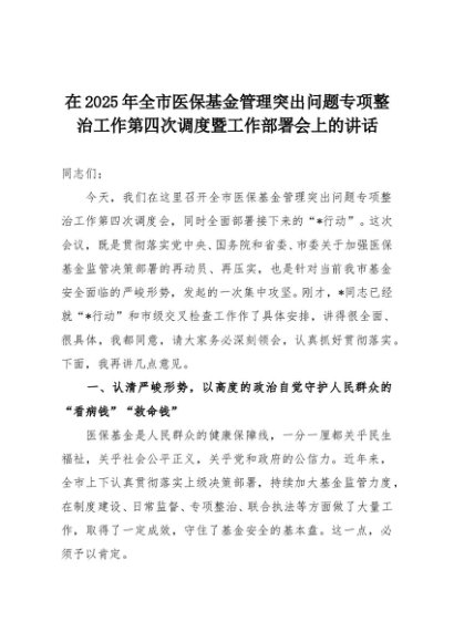 【七哥公文】2025年:在2025年全市医保基金管理突出问题专项整治工作第四次调度暨工作部署会上的讲话+更多免费公文+VX:QiGeGongWen2024