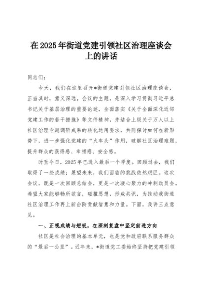 / 【七哥公文】2025年:在2025年街道党建引领社区治理座谈会上的讲话+更多免费公文+VX:QiGeGongWen2024