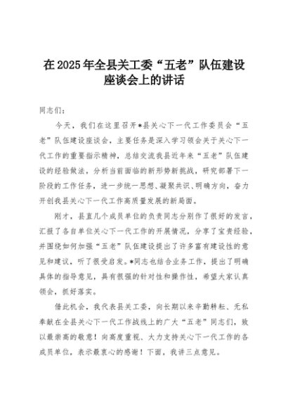 【七哥公文】2025年:在2025年全县关工委“五老”队伍建设座谈会上的讲话+更多免费公文+VX:QiGeGongWen2024