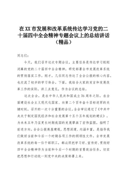 【七哥公文】2025年:在XX市发展和改革系统传达学习党的二十届四中全会精神专题会议上的总结讲话(精品)+更多免费公文+VX:QiGeGongWen2024