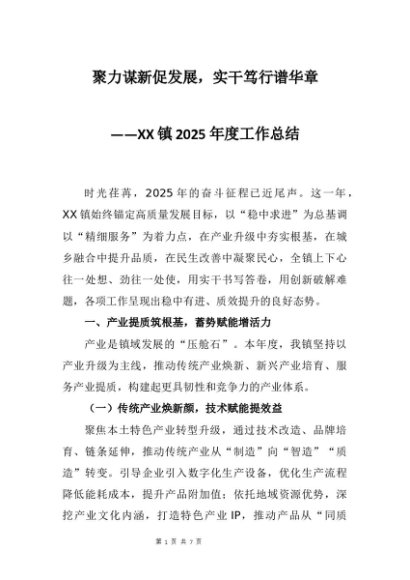 【七哥公文】2025年:XX镇2025年度工作总结:聚力谋新促发展,实干笃行谱华章+更多免费公文+VX:QiGeGongWen2024