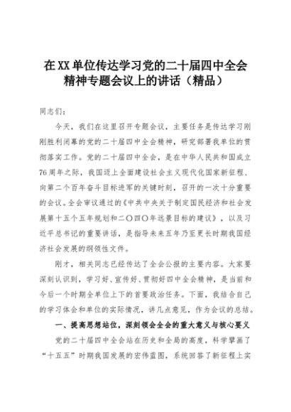 【七哥公文】2025年:在XX单位传达学习党的二十届四中全会精神专题会议上的讲话(精品)+更多免费公文+VX:QiGeGongWen2024