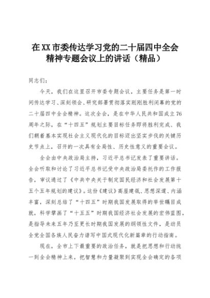 【七哥公文】2025年:在XX市委传达学习党的二十届四中全会精神专题会议上的讲话(精品)+更多免费公文+VX:QiGeGongWen2024