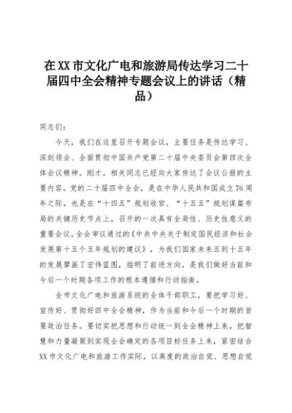 【七哥公文】2025年:在XX市文化广电和旅游局传达学习二十届四中全会精神专题会议上的讲话(精品)+更多免费公文+VX:QiGeGongWen2024