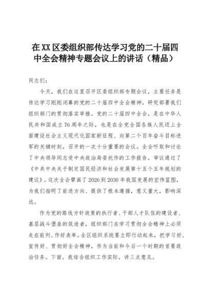 【七哥公文】2025年:在XX区委组织部传达学习党的二十届四中全会精神专题会议上的讲话(精品)+更多免费公文+VX:QiGeGongWen2024
