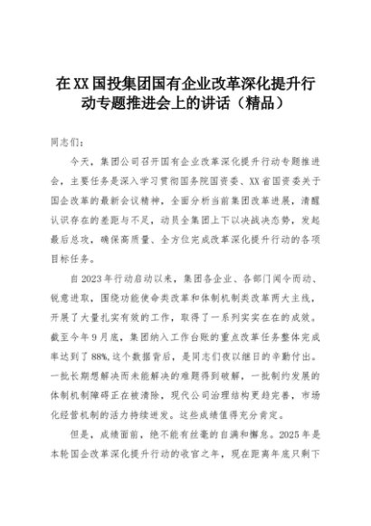 【七哥公文】2025年:在XX国投集团国有企业改革深化提升行动专题推进会上的讲话(精品)+更多免费公文+VX:QiGeGongWen2024