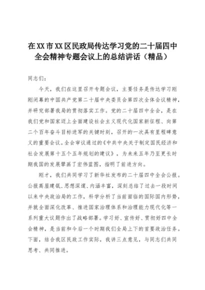 【七哥公文】2025年:在XX市XX区民政局传达学习党的二十届四中全会精神专题会议上的总结讲话(精品)+更多免费公文+VX:QiGeGongWen2024