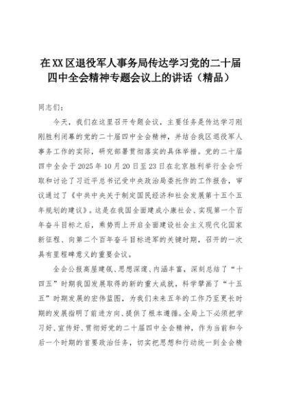 【七哥公文】2025年:在XX区退役军人事务局传达学习党的二十届四中全会精神专题会议上的讲话(精品)+更多免费公文+VX:QiGeGongWen2024