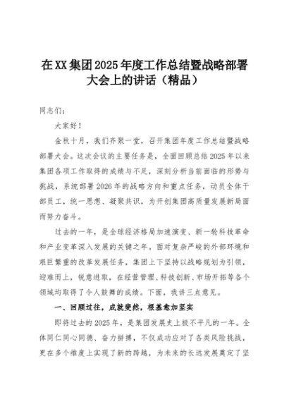 【七哥公文】2025年:在XX集团2025年度工作总结暨战略部署大会上的讲话(精品)+更多免费公文+VX:QiGeGongWen2024