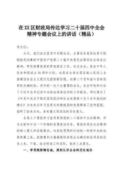 【七哥公文】2025年:在XX区财政局传达学习二十届四中全会精神专题会议上的讲话(精品)+更多免费公文+VX:QiGeGongWen2024