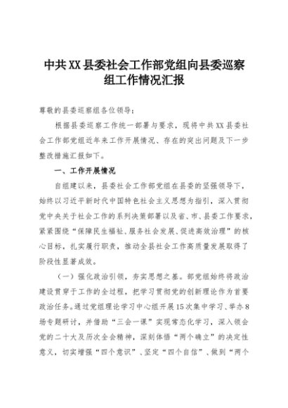 【七哥公文】2025年:中共XX县委社会工作部党组向县委巡察组工作情况汇报+更多免费公文+VX:QiGeGongWen2024
