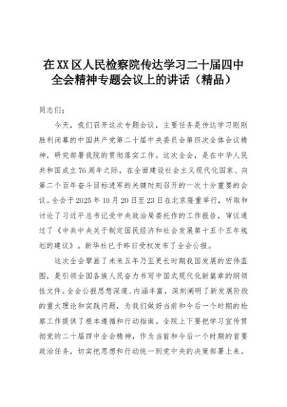 【七哥公文】2025年:在XX区人民检察院传达学习二十届四中全会精神专题会议上的讲话(精品)+更多免费公文+VX:QiGeGongWen2024