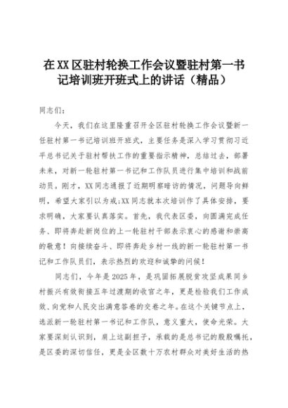 【七哥公文】2025年:在XX区驻村轮换工作会议暨驻村第一书记培训班开班式上的讲话(精品)+更多免费公文+VX:QiGeGongWen2024