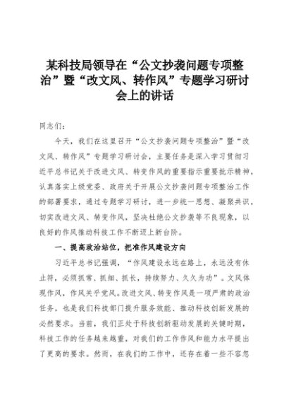 【七哥公文】2025年:某科技局领导在“公文抄袭问题专项整治”暨“改文风、转作风”专题学习研讨会上的讲话+更多免费公文+VX:QiGeGongWen2024