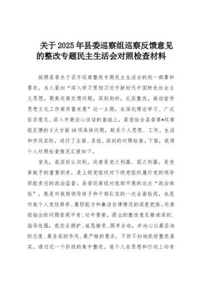【七哥公文】2025年:关于2025年县委巡察组巡察反馈意见的整改专题民主生活会对照检查材料+更多免费公文+VX:QiGeGongWen2024