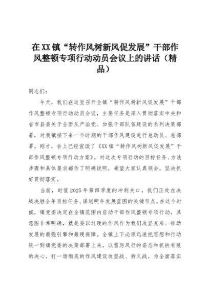【七哥公文】2025年:在XX镇“转作风树新风促发展”干部作风整顿专项行动动员会议上的讲话(精品)+更多免费公文+VX:QiGeGongWen2024