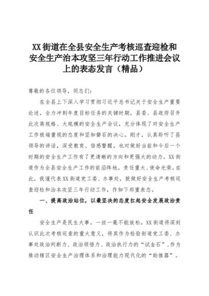 【七哥公文】2025年:XX街道在全县安全生产考核巡查迎检和安全生产治本攻坚三年行动工作推进会议上的表态发言(精品)+更多免费公文+VX:QiGeGongWen2024