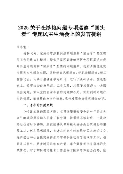 【七哥公文】2025年:2025关于在涉粮问题专项巡察“回头看”专题民主生活会上的发言提纲+更多免费公文+VX:QiGeGongWen2024