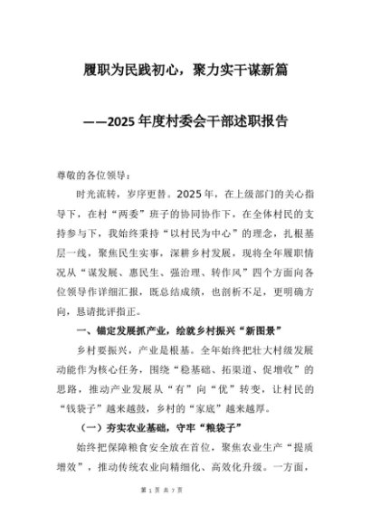 【七哥公文】2025年:2025年度村委会干部述职报告:履职为民践初心,聚力实干谋新篇+更多免费公文+VX:QiGeGongWen2024