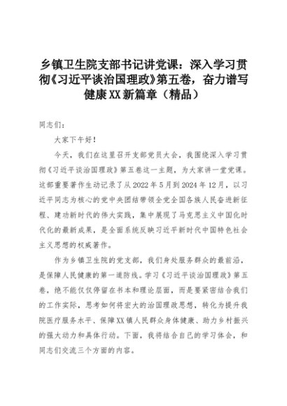 【七哥公文】2025年:乡镇卫生院支部书记讲党课:深入学习贯彻《习近平谈治国理政》第五卷,奋力谱写健康XX新篇章(精品)+更多免费公文+VX:QiGeGongWen2024