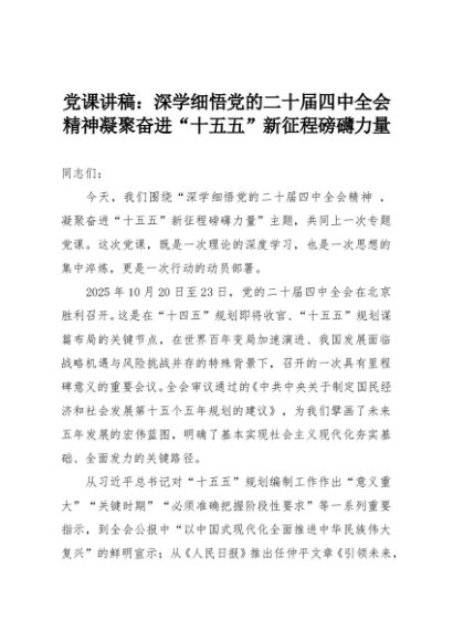 【七哥公文】2025年:党课讲稿:深学细悟党的二十届四中全会精神凝聚奋进“十五五”新征程磅礴力量+更多免费公文+VX:QiGeGongWen2024