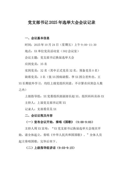 【七哥公文】2025年:党支部书记2025年选举大会会议记录+更多免费公文+VX:QiGeGongWen2024