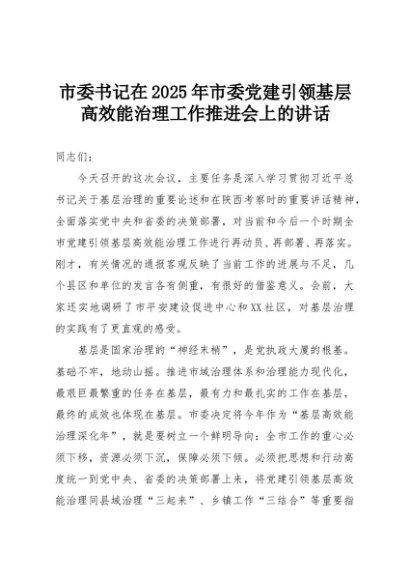 【七哥公文】2025年:市委书记在2025年市委党建引领基层高效能治理工作推进会上的讲话+更多免费公文+VX:QiGeGongWen2024