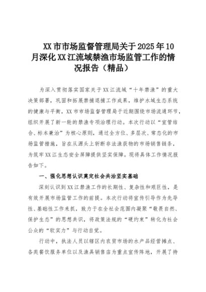 【七哥公文】2025年:XX市市场监督管理局关于2025年10月深化XX江流域禁渔市场监管工作的情况报告(精品)+更多免费公文+VX:QiGeGongWen2024