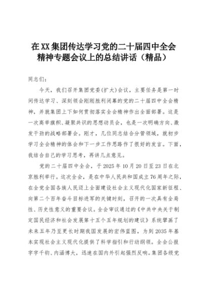 【七哥公文】2025年:在XX集团传达学习党的二十届四中全会精神专题会议上的总结讲话(精品)+更多免费公文+VX:QiGeGongWen2024