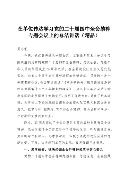 【七哥公文】2025年:在单位传达学习党的二十届四中全会精神专题会议上的总结讲话(精品)+更多免费公文+VX:QiGeGongWen2024
