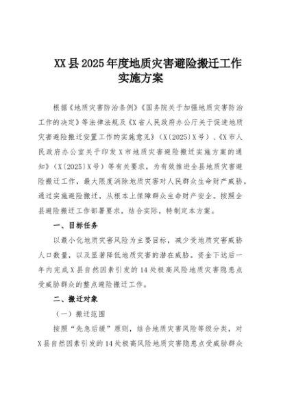 / 【七哥公文】2025年:XX县2025年度地质灾害避险搬迁工作实施方案+更多免费公文+VX:QiGeGongWen2024