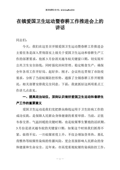/ 【七哥公文】2026年:在镇爱国卫生运动暨春耕工作推进会上的讲话+更多免费公文+VX:QiGeGongWen2024