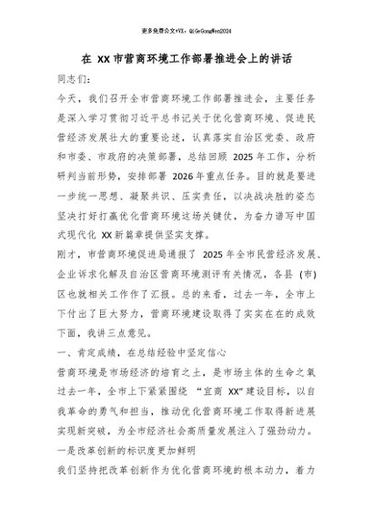 【七哥公文】2026年:在 XX 市营商环境工作部署推进会上的讲话_副本+更多免费公文+VX:QiGeGongWen2024