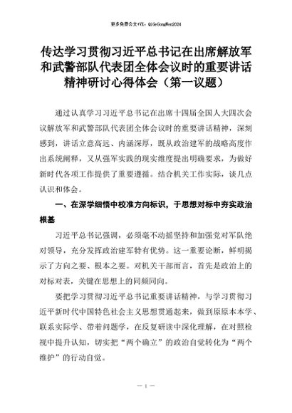 【七哥公文】2026年:传达学习贯彻习近平总书记在出席解放军和武警部队代表团全体会议时的重要讲话精神研讨心得体会(第一议题)+更多免费公文+VX:QiGeGongWen2024