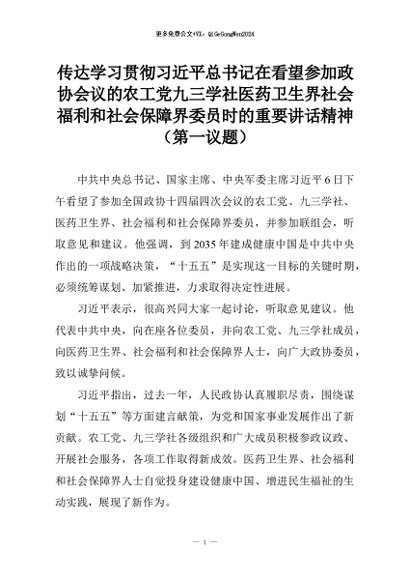 【七哥公文】2026年:传达学习贯彻习近平总书记在看望参加政协会议的农工党九三学社医药卫生界社会福利和社会保障界委员时的重要讲话精神(第一议题)+更多免费公文+VX:QiGeGongWen2024