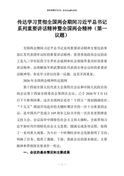 【七哥公文】2026年:传达学习贯彻全国两会期间习近平总书记系列重要讲话精神暨全国两会精神(第一议题)+更多免费公文+VX:QiGeGongWen2024