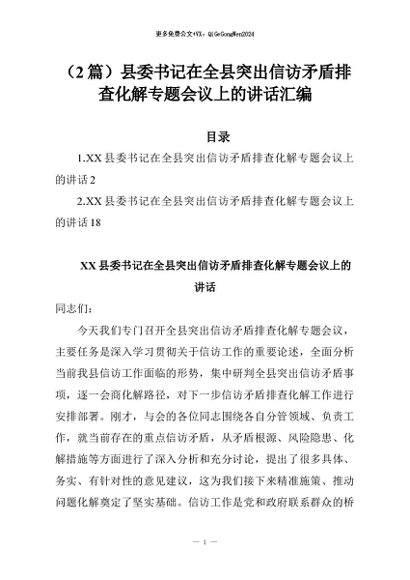 【七哥公文】2026年:(2篇)县委书记在全县突出信访矛盾排查化解专题会议上的讲话汇编+更多免费公文+VX:QiGeGongWen2024