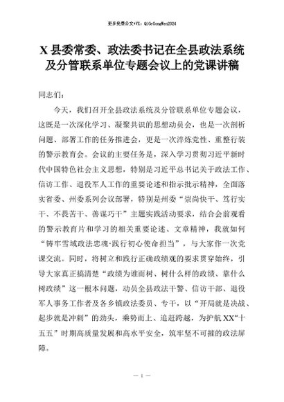 【七哥公文】2026年:X县委常委、政法委书记在全县政法系统及分管联系单位专题会议上的党课讲稿+更多免费公文+VX:QiGeGongWen2024