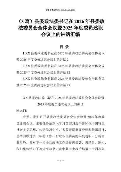 【七哥公文】2026年:(3篇)县委政法委书记在2026年县委政法委员会全体会议暨2025年度委员述职会议上的讲话汇编+更多免费公文+VX:QiGeGongWen2024