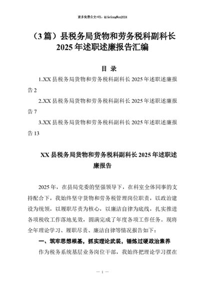【七哥公文】2026年:(3篇)县税务局货物和劳务税科副科长2025年述职述廉报告汇编+更多免费公文+VX:QiGeGongWen2024