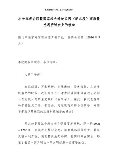 【七哥公文】2026年:在长江考古联盟国家考古遗址公园(湖北段)高质量发展研讨会上的致辞_副本+更多免费公文+VX:QiGeGongWen2024