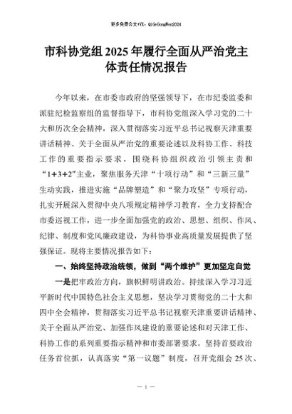 【七哥公文】2026年:市科协党组2025年履行全面从严治党主体责任情况报告+更多免费公文+VX:QiGeGongWen2024