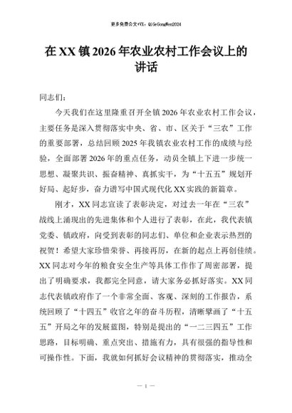 / 【七哥公文】2026年:在XX镇2026年农业农村工作会议上的讲话+更多免费公文+VX:QiGeGongWen2024